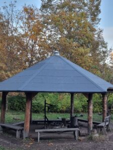 Arbete med att lägga takpapp på det nya taket vid grill platsen, Kvarnhagstorp (2024)